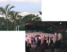 上から沖縄の海、下は観光客と踊る民謡保存会。(2001.12.26.撮影)
